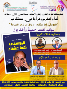تنظم كلية اللغات والفنون والعلوم الإنسانية بسطات لقاء تقديم وقراءة في كتاب “اليوسفي كما عشناه: أوراق من زمن السياسة” لمؤلفَيْه الأستاذين محمد حفيظ وأحمد بوز، وذلك يوم الخميس 07 مارس 2024، على الساعة العاشرة والنصف صباحا (10:30) بمركز الاستقبال والندوات.