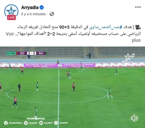 ونشرت القناة عبر صفحتها على “فايسبوك” أن لاعب الرجاء البيضاوي عبد الصمد البدوي، سجل هدف الفوز لناديه في الوقت البدل الضائع لتصبح النتيحة 2-2 بين أولمبيك آسفي والرجاء الرياضي.
